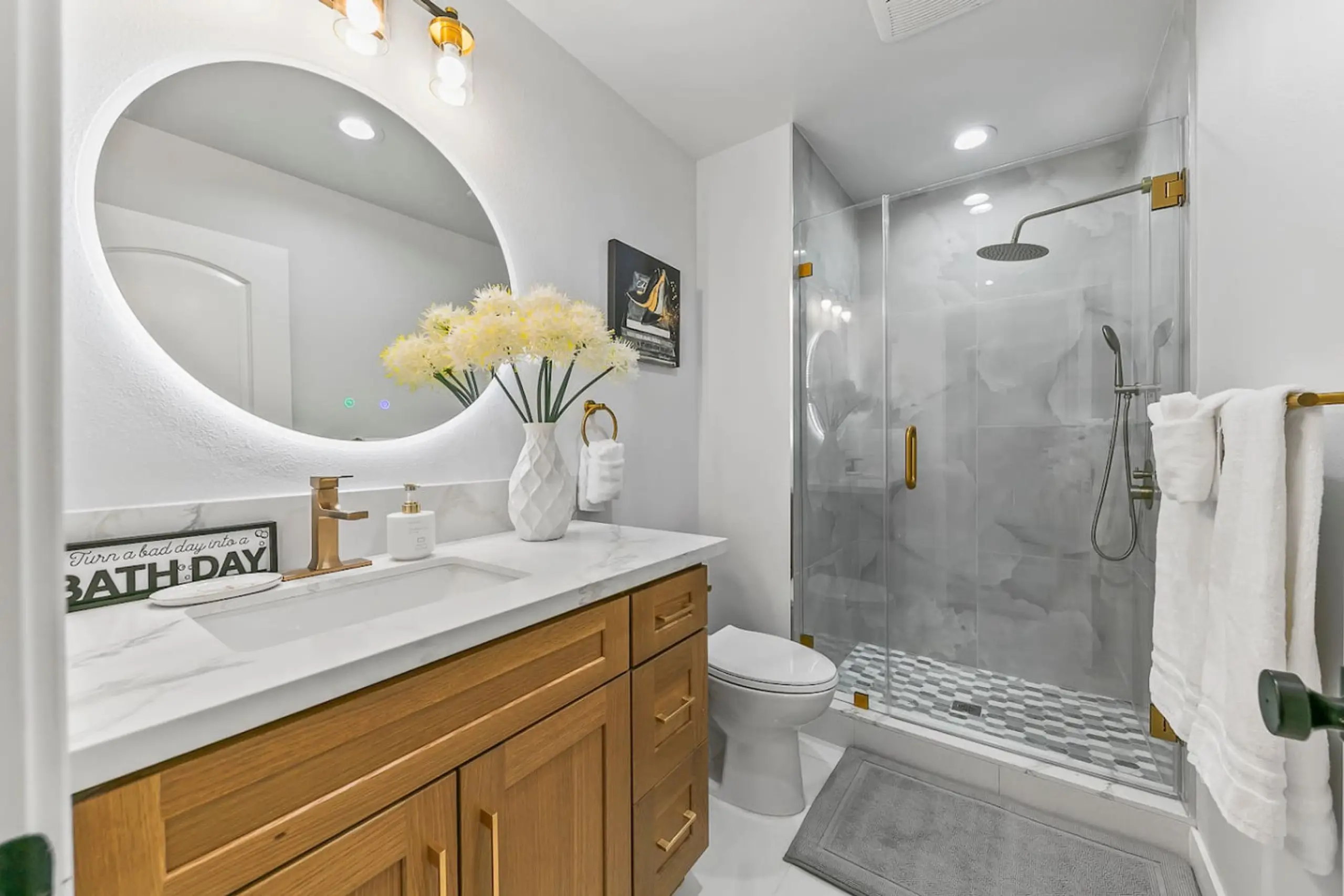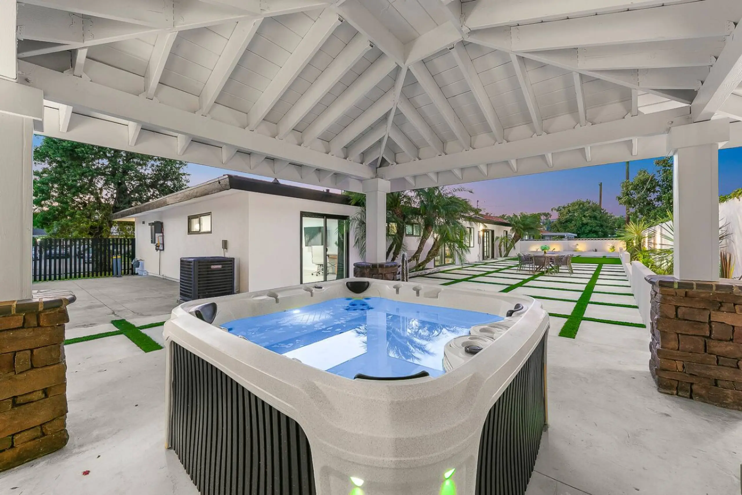 The house features 4 bedrooms, 3 full bathrooms, a full kitchen, and a comfortable living room. Enjoy the private backyard with a BBQ grill, jacuzzi, and outdoor dining area. With easy access to freeways (5, 22, 405, and 91) and close proximity to Disneyland, restaurants, and entertainment, this home is the ideal getaway for your Anaheim visit.