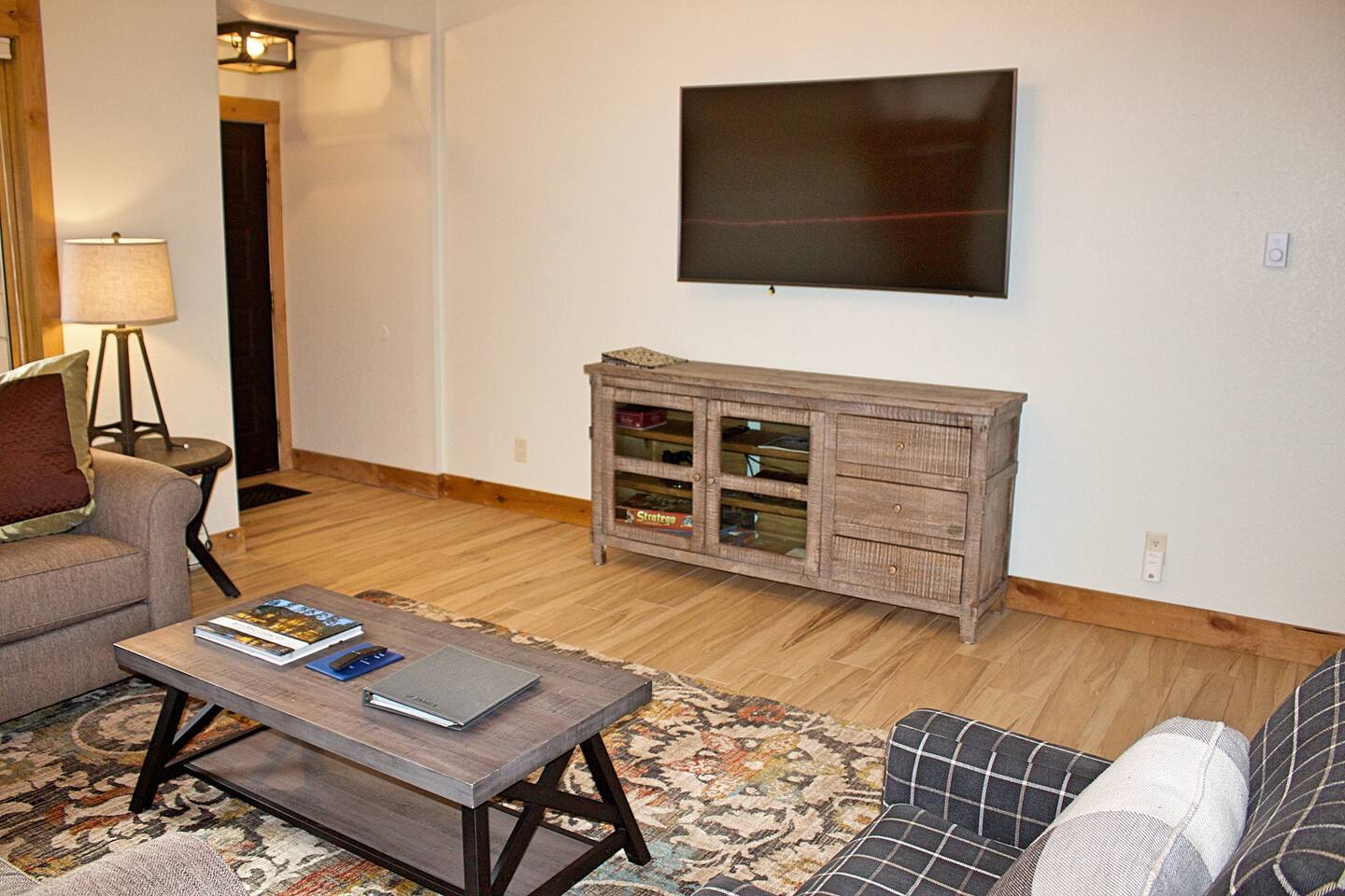This modern mountain retreat features an open living area with a large sectional sofa, gas fireplace, and flat-screen TV. The kitchen and dining area sit just above the living room, creating an easy flow for gathering. Guests also enjoy a private patio, in-unit washer and dryer, garage parking, and seasonal access to the Upper Village pool and hot tubs across the street.