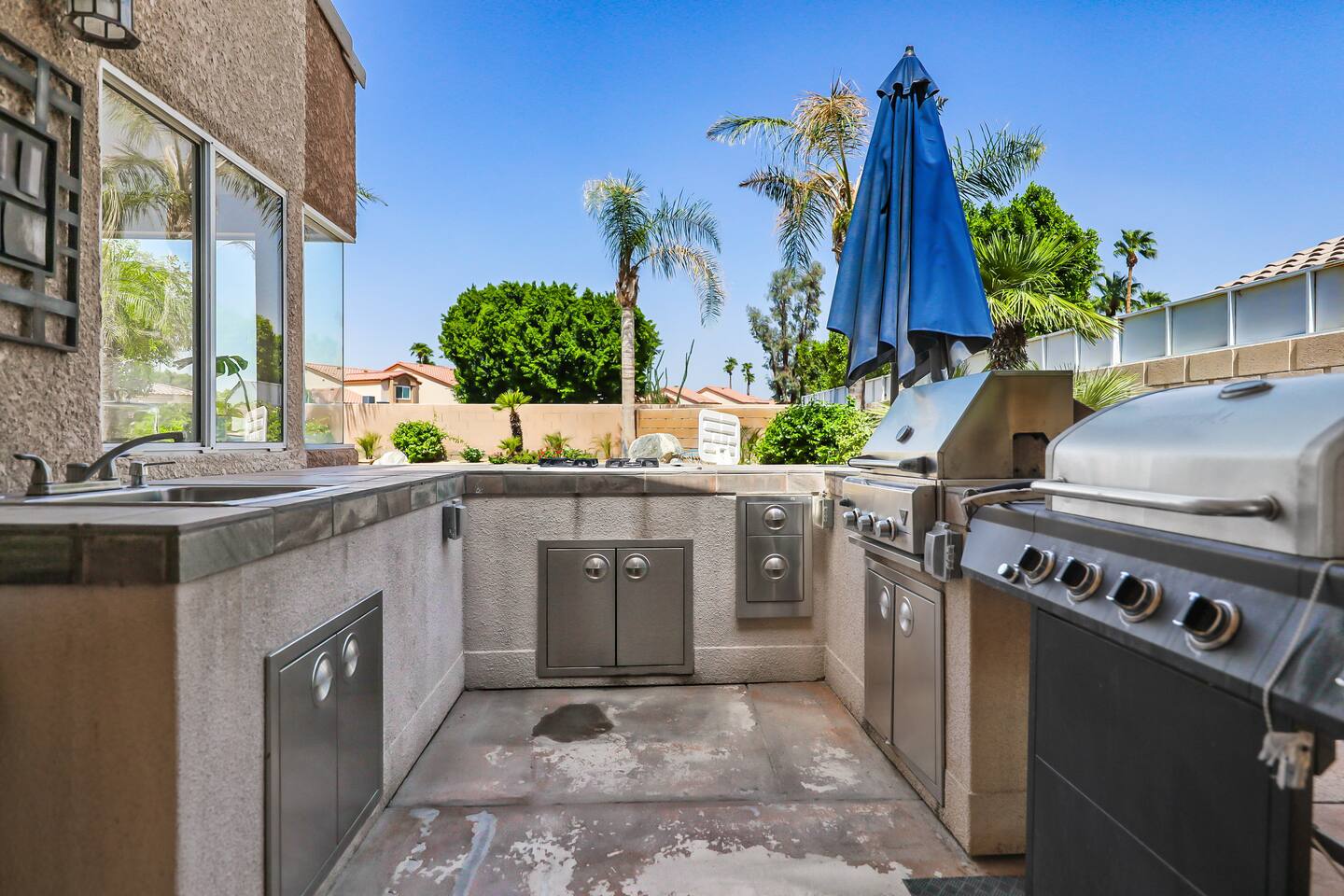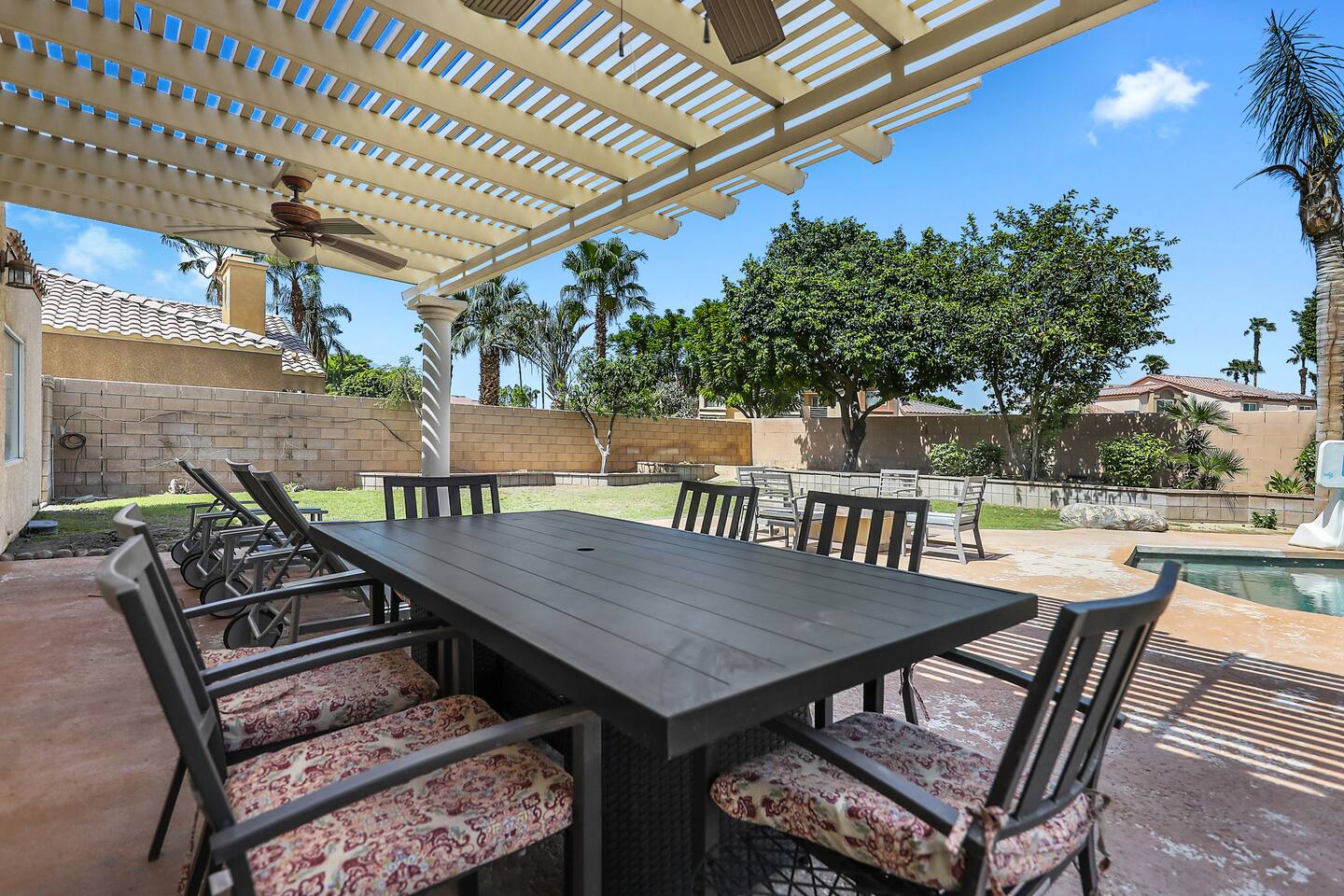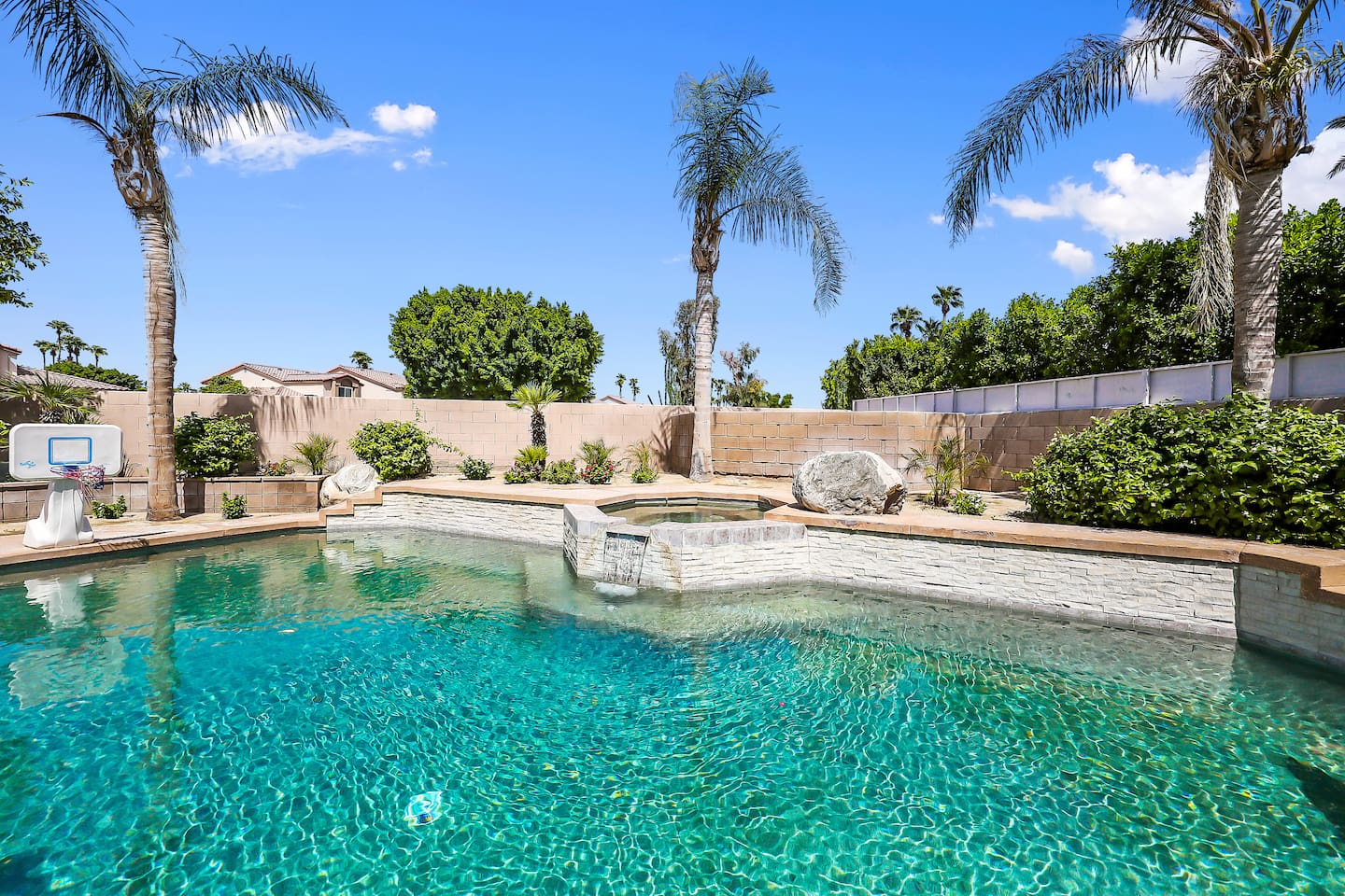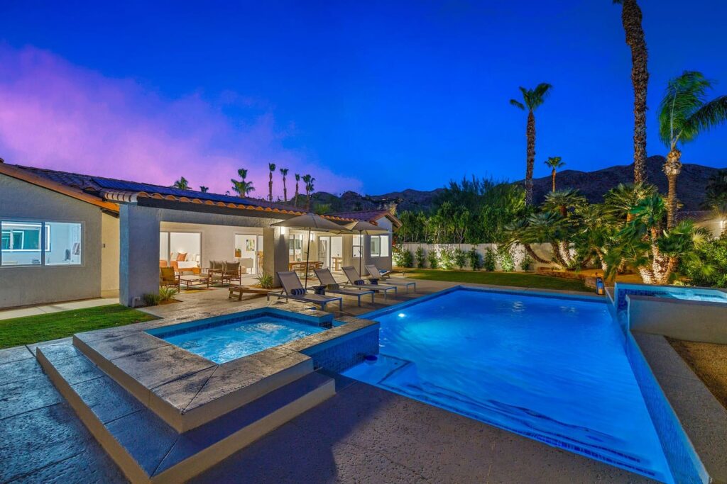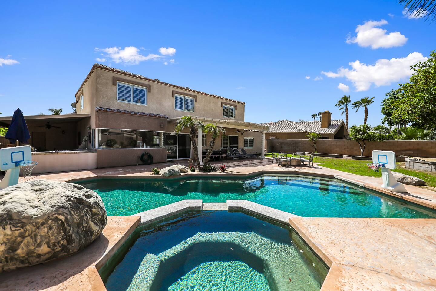 Spacious and spectacular 5-bedroom vacation home with a private pool and spa in La Quinta, designed for relaxing desert escapes with family and friends. The private backyard features a crystal-clear pool and spa with optional heating, lush landscaping, outdoor dining, and a BBQ entertainment area—creating the perfect luxury desert retreat. The interior is highly updated with premium finishes, including a newly renovated kitchen and a brand-new game room.