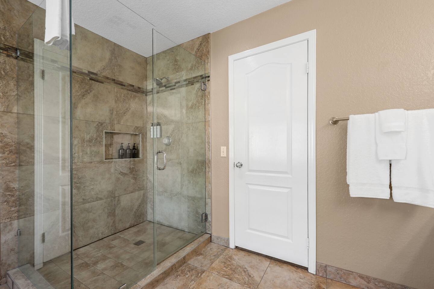 • Bedroom 3 (Downstairs): Queen-size bed, shared bathroom with tub/shower combo