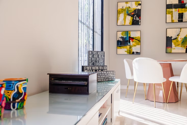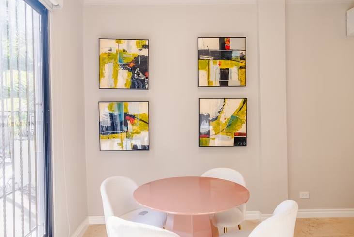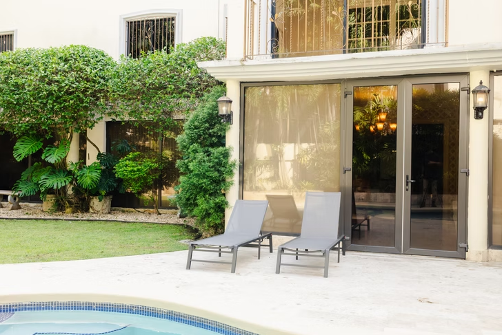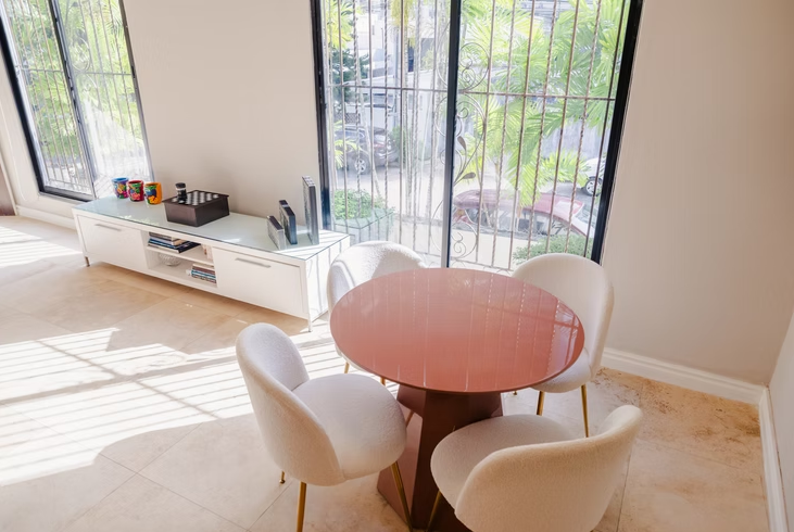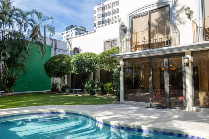 The home features generous living and dining areas furnished with modern pieces and large windows overlooking the garden and private outdoor pool. Guests can enjoy staying active with the on-site gym, relax by the pool on warm days, and take advantage of a fully equipped kitchen designed for preparing delicious meals. Additional conveniences include private parking and in-home laundry, all just minutes from Panama City’s top attractions.