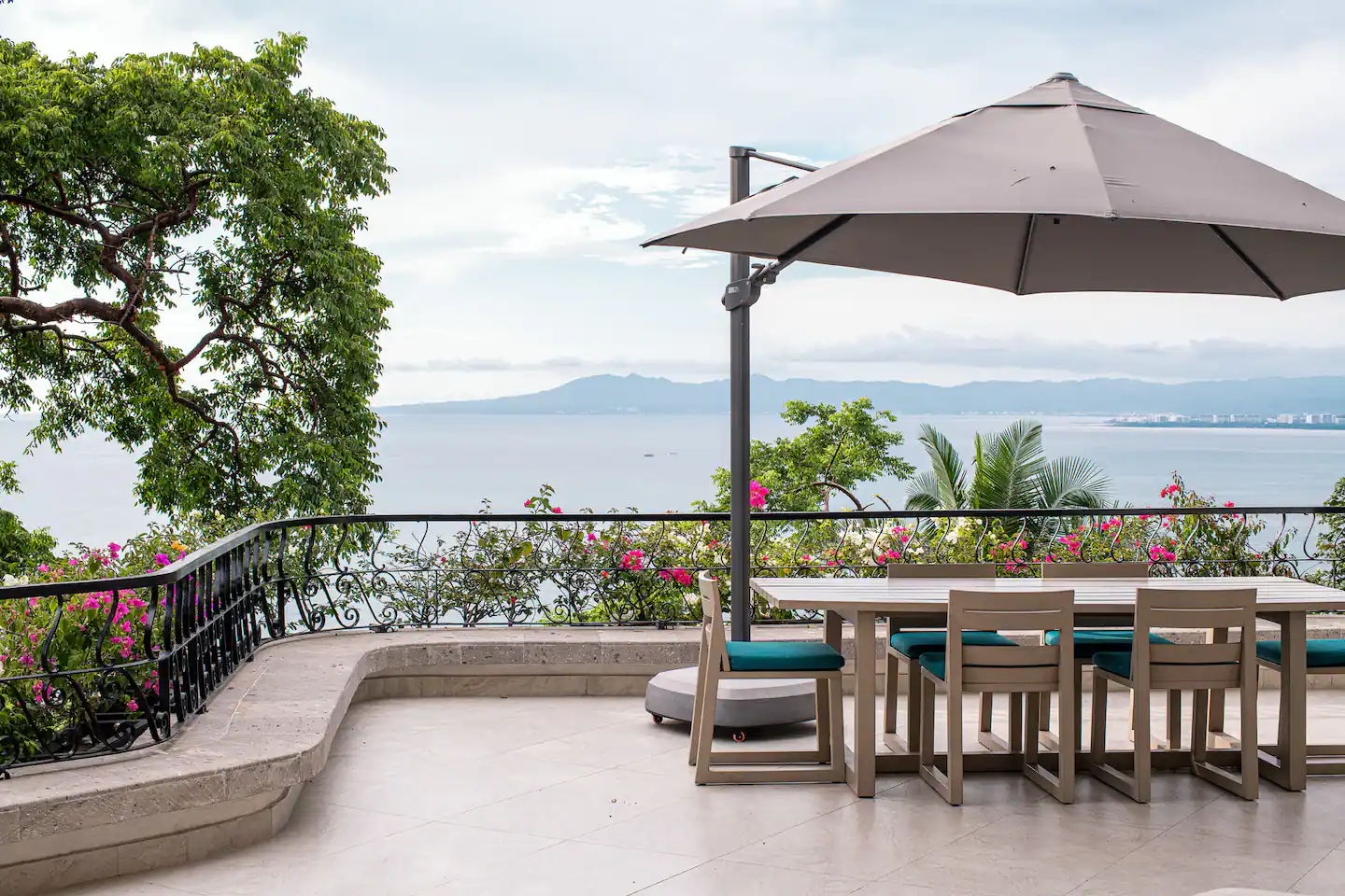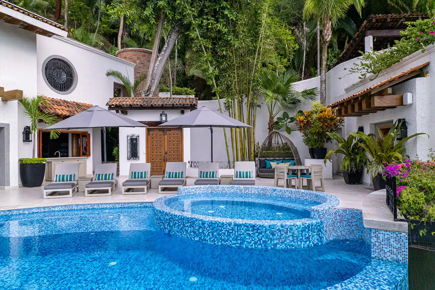 The villa offers total privacy just minutes from Los Muertos Beach and the Romantic Zone. With 3,500 sq ft of outdoor living space, panoramic views of Banderas Bay, the Marietas Islands, and downtown Puerto Vallarta, a private heated pool and jacuzzi, oversized umbrellas, luxury loungers, and two outdoor dining areas, the property delivers a seamless indoor/outdoor experience in a secluded jungle setting. Located inside a gated community with private security, the villa also includes a full staff of four with daily housekeeping and two meals per day prepared by a private chef (Monday–Saturday).