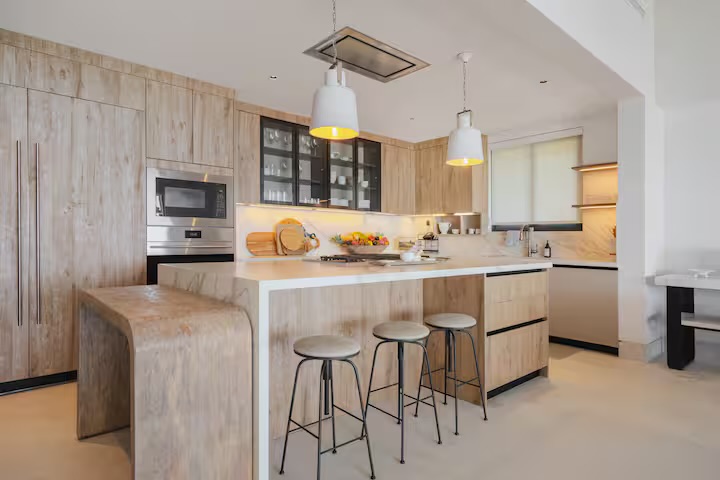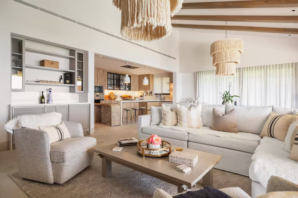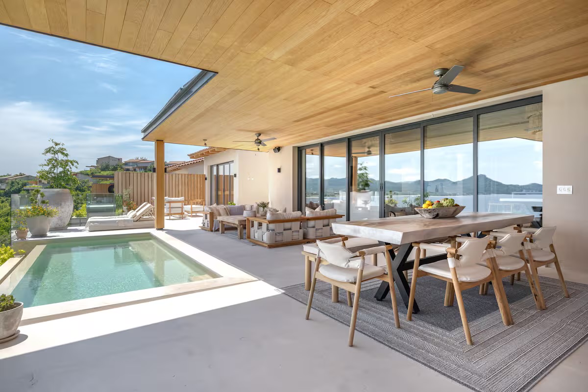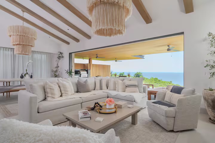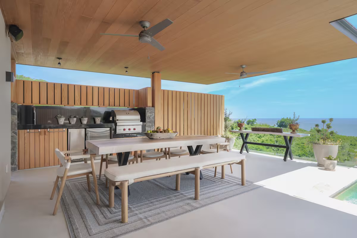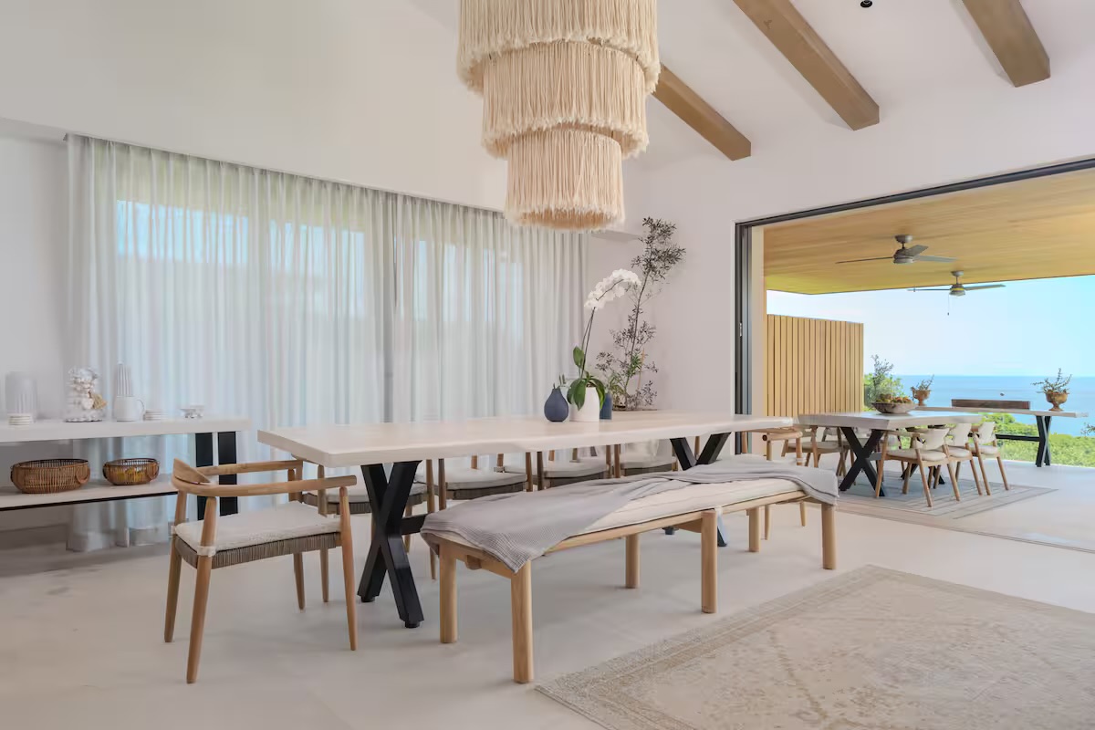 The heart of the villa is the expansive terrace, featuring a private infinity pool, sun loungers, and an outdoor dining area with a professional grill. Inside, the open-concept living and dining areas flow effortlessly into a fully equipped gourmet kitchen, reflecting the understated elegance and coastal sophistication of Punta Mita.