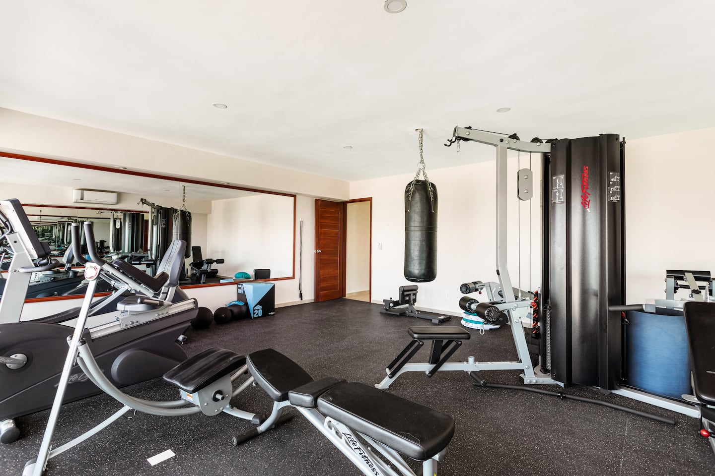 • Exercise equipment (elliptical, dumbbells, stationary bike, yoga mat, weight bench, rowing machine)