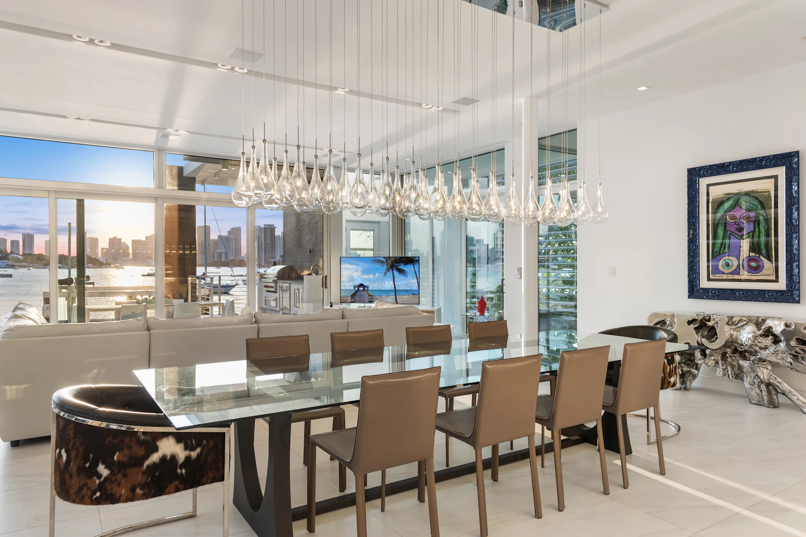 The 6-bedroom, 7.5-bathroom haven features a gourmet kitchen with top appliances, custom bar, private movie theatre with leather recliners, dedicated gym, and outdoor kitchen. All second-floor bedrooms boast private balconies with water views. The outdoor experience is elevated by a heated infinity edge lap pool, Jacuzzi with fire pit feature, and an expansive rooftop lounge offering breathtaking 360-degree views of the bay and city. With 85 feet of waterfront, a dock with boat lift, and stunning sunset views, this 10,890-square-foot lot creates the perfect setting for up to 12 guests.
