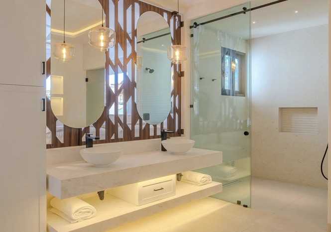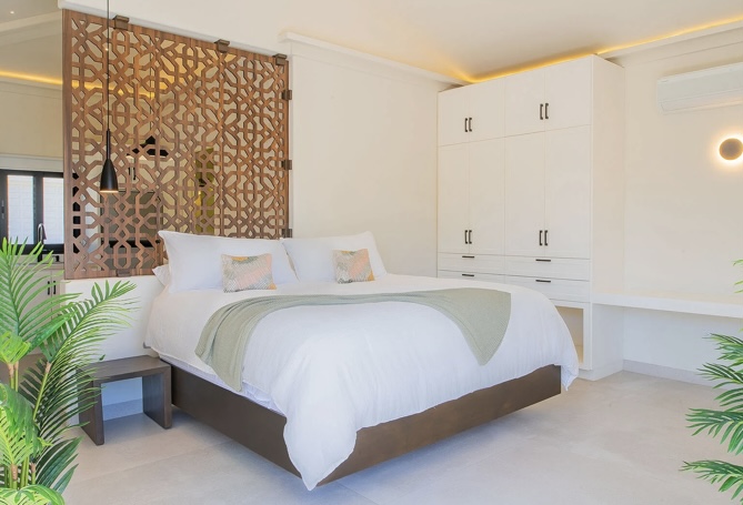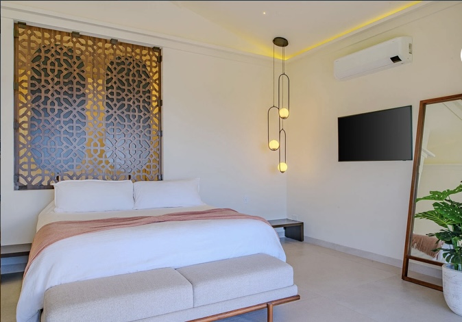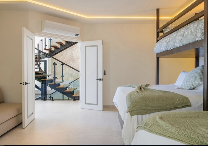 Designed for entertaining and relaxation, the villa features floor-to-ceiling glass walls, seamless indoor-outdoor living, and breathtaking ocean views. The expansive terrace includes a ledge pool, jacuzzi, outdoor kitchen, and bar with HDTV, ideal for sunset gatherings. Indoors, enjoy a private spa, fully equipped gym, and a cinema room with a 100” screen. Each bedroom offers ocean views, a private terrace, and king-size beds—perfect for unforgettable stays by the sea.