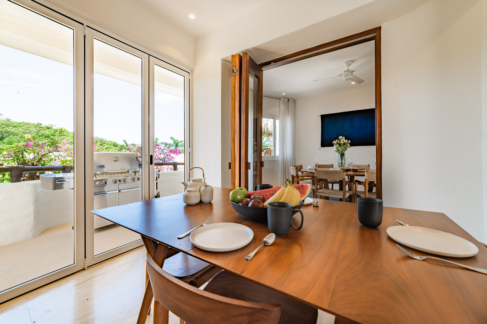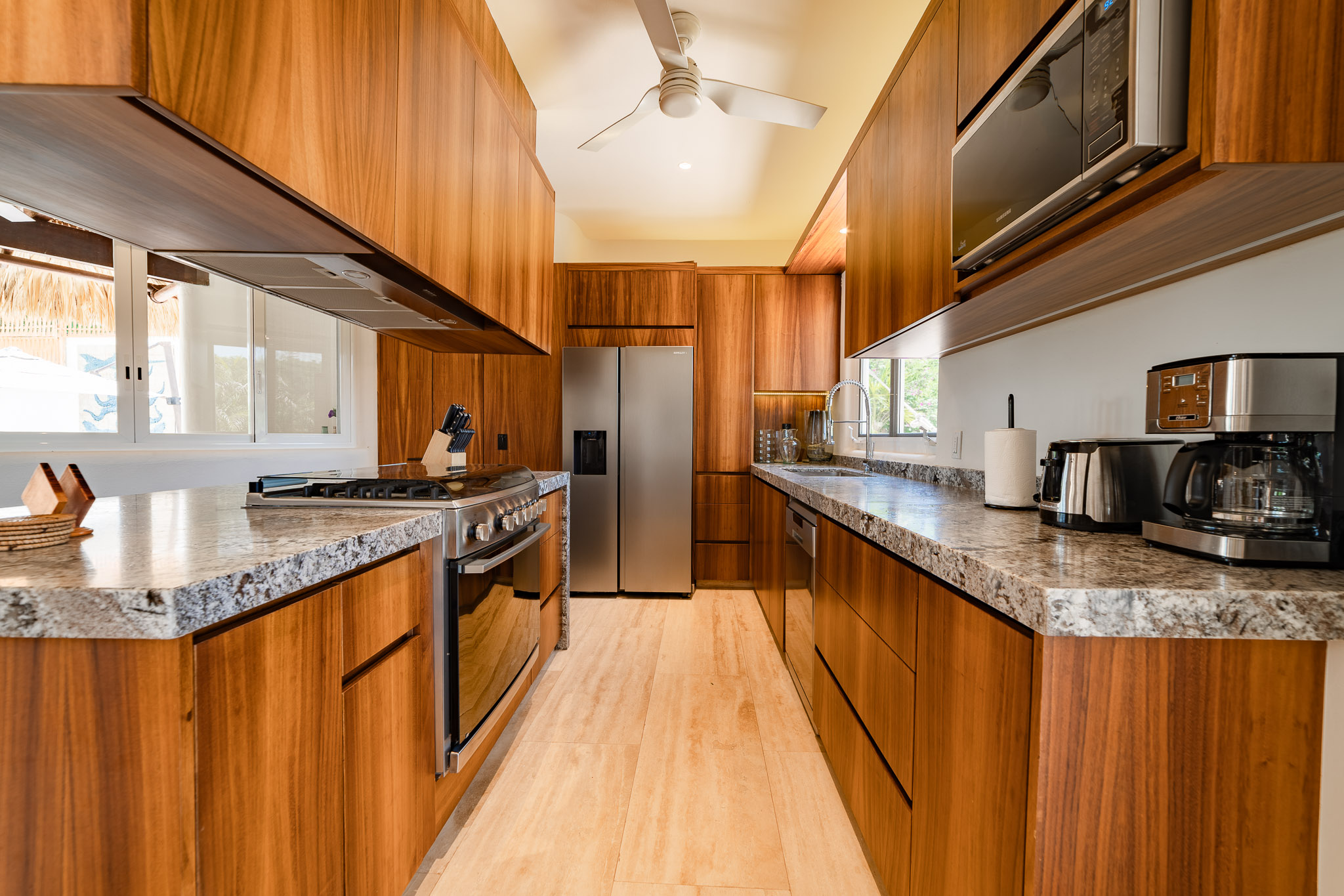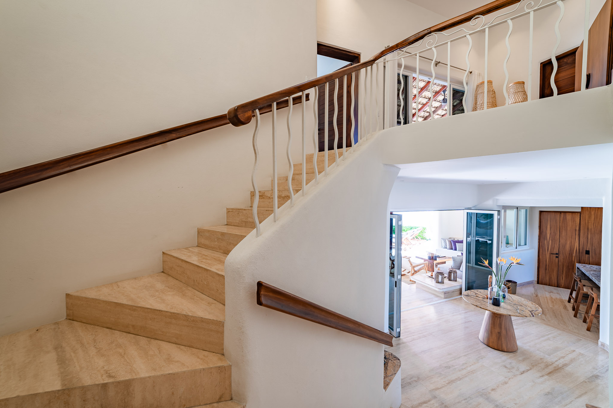 The main level features an open-concept chef’s kitchen, fully equipped with luxury appliances, a breakfast bar, and a casual dining space. For a more formal experience, enjoy the beautifully renovated dining area. The indoor living space includes a Smart TV, a powder room, and a back terrace with a BBQ grill. The upper level offers three elegant guest suites, each with a private bath. A shared terrace provides seating and a shaded hammock, the perfect spot for an afternoon siesta.