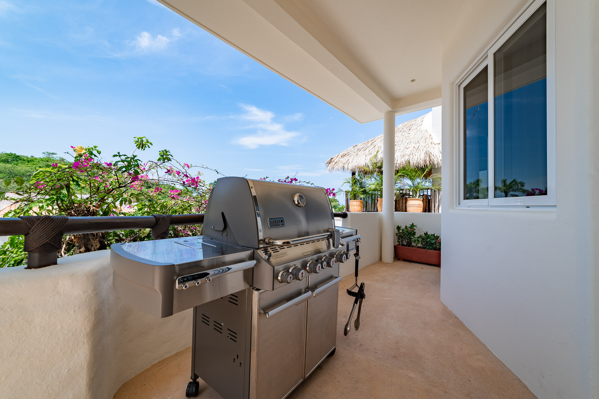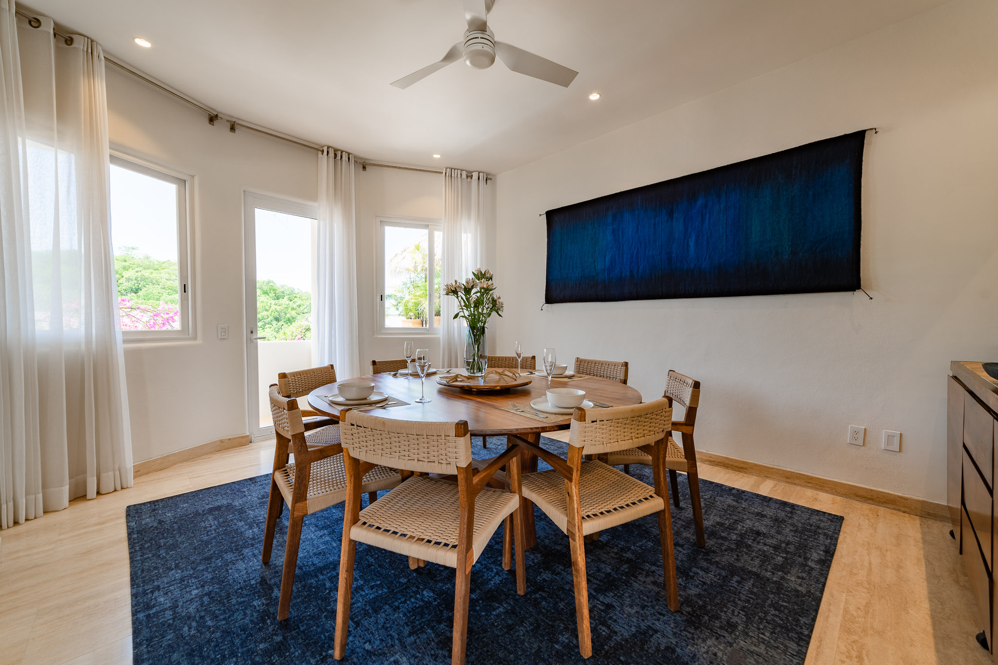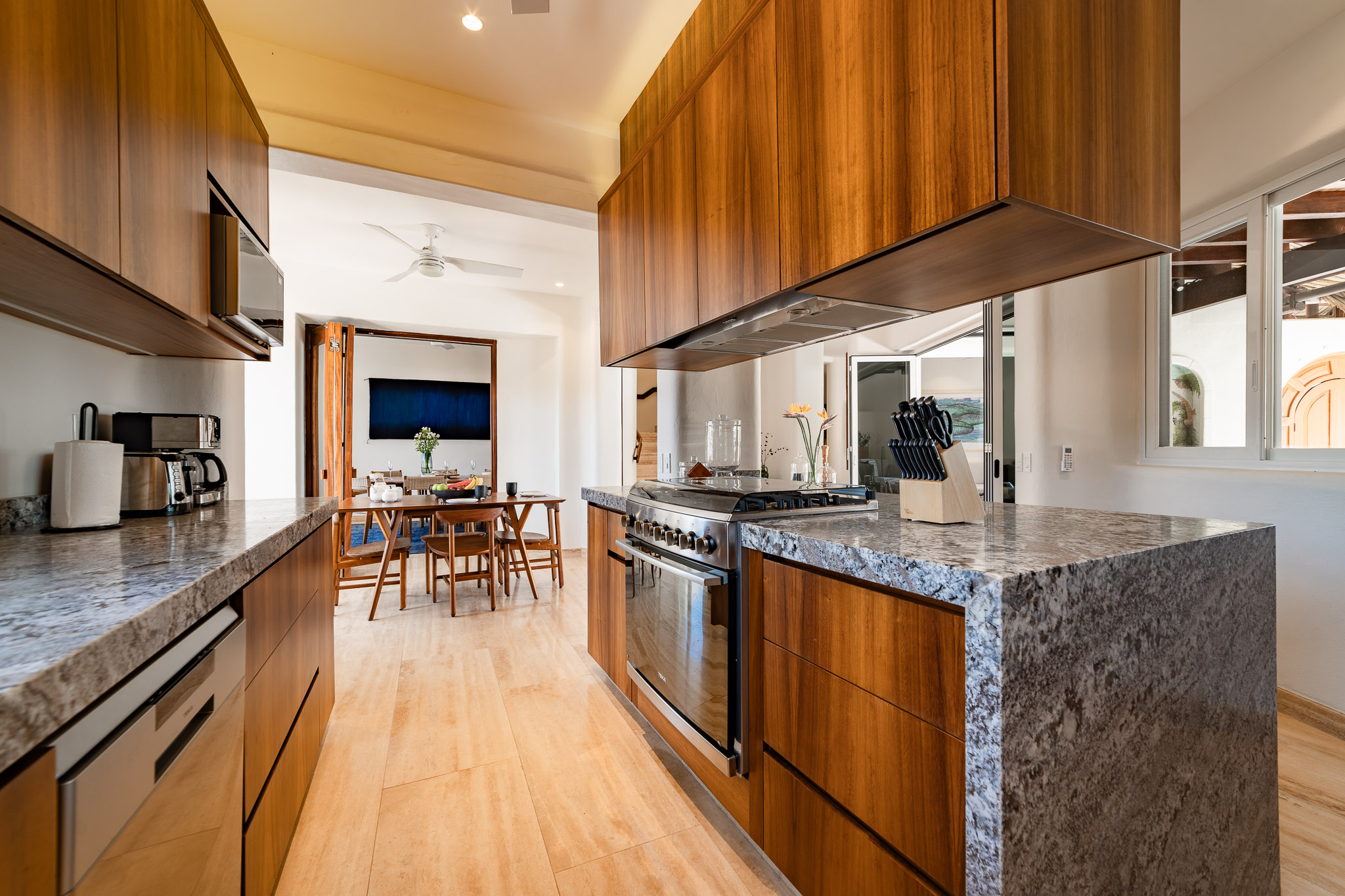The main level features an open-concept chef’s kitchen, fully equipped with luxury appliances, a breakfast bar, and a casual dining space. For a more formal experience, enjoy the beautifully renovated dining area. The indoor living space includes a Smart TV, a powder room, and a back terrace with a BBQ grill. The upper level offers three elegant guest suites, each with a private bath. A shared terrace provides seating and a shaded hammock, the perfect spot for an afternoon siesta.