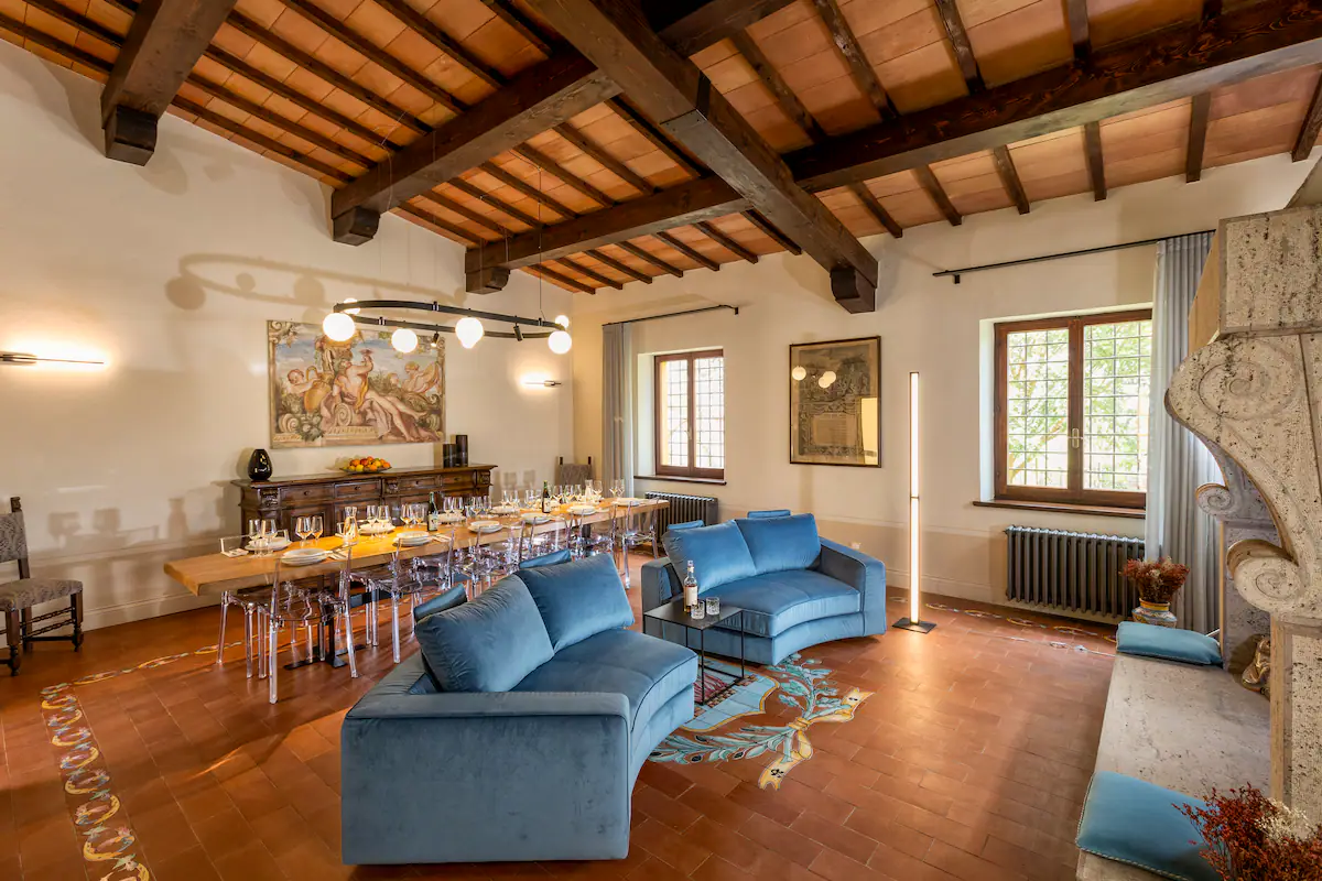 The 450 sqm villa is distributed over two levels connected by a marble staircase and a beautiful wooden loft leading to the bedrooms. The ground floor features two elegant living rooms with fireplaces connected by an ancient noble courtyard, two reading/TV rooms, two dining rooms, two fully equipped kitchens, a double guest bathroom, one standard bedroom, and one superior bedroom. The upper floor includes one suite, two superior bedrooms, and two standard bedrooms, all with air conditioning, LED flat-screen TV, and en-suite bathrooms. Outside, guests enjoy an Italian garden, large green areas with outdoor dining and lounge spaces, a historic lemon house surrounded by roses, and a private mini pool with hydromassage.