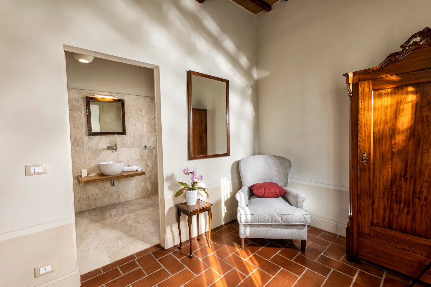 Villa Pianoia is a historic hillside residence overlooking the medieval town of Montepulciano and the hills of the Val d’Orcia. A careful restoration has returned the villa to its former splendor, preserving its original charm with exposed wooden beams, terracotta floors, and antiques blended with modern design elements. The property offers panoramic views of the Tuscan countryside, vineyards, valley, and surrounding parkland.