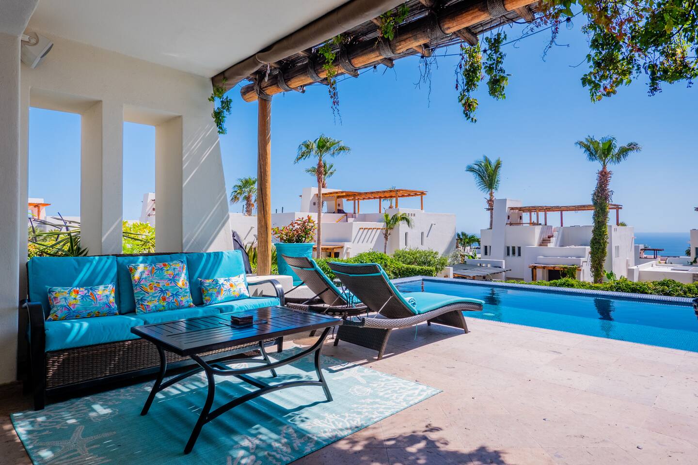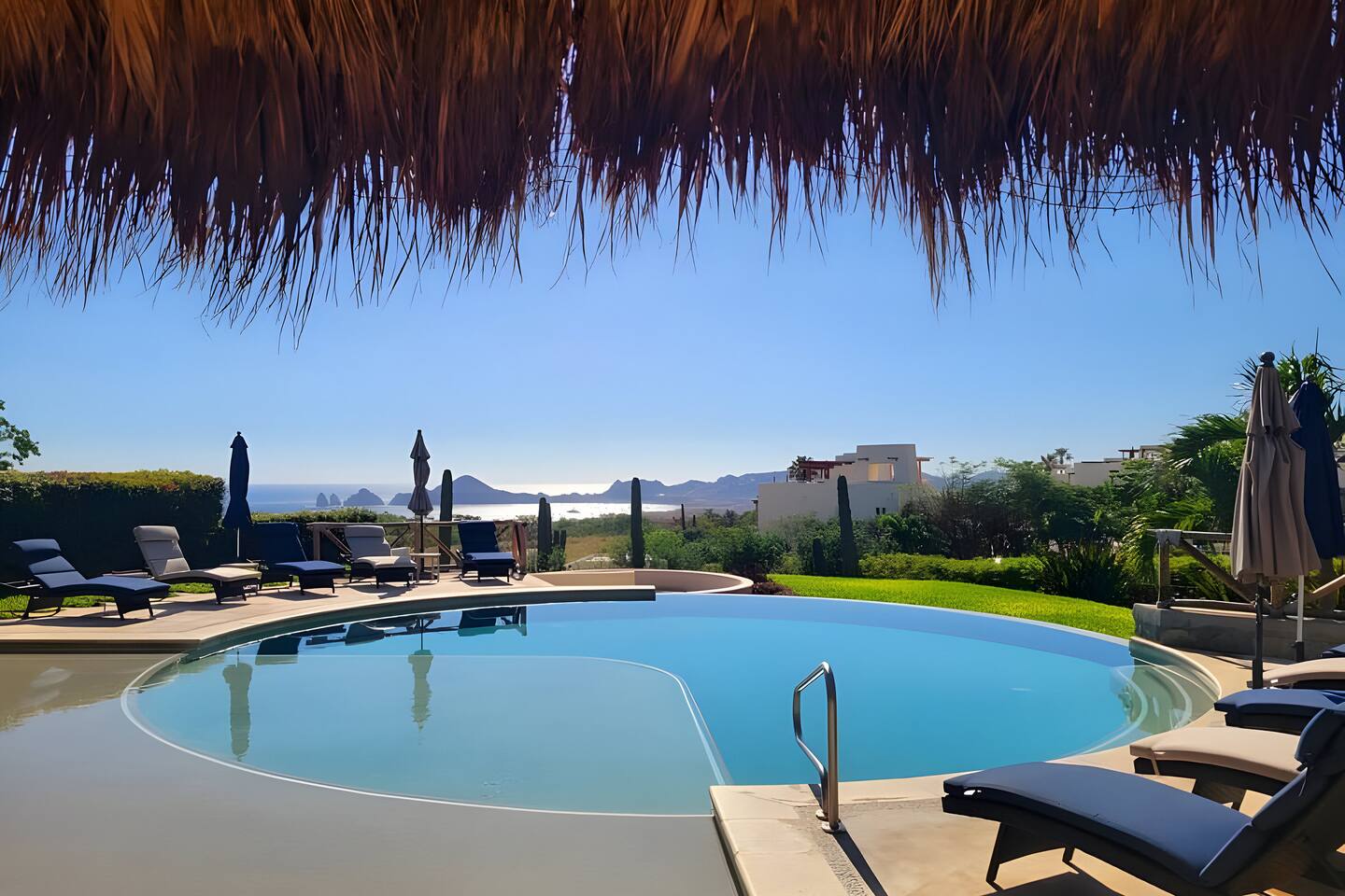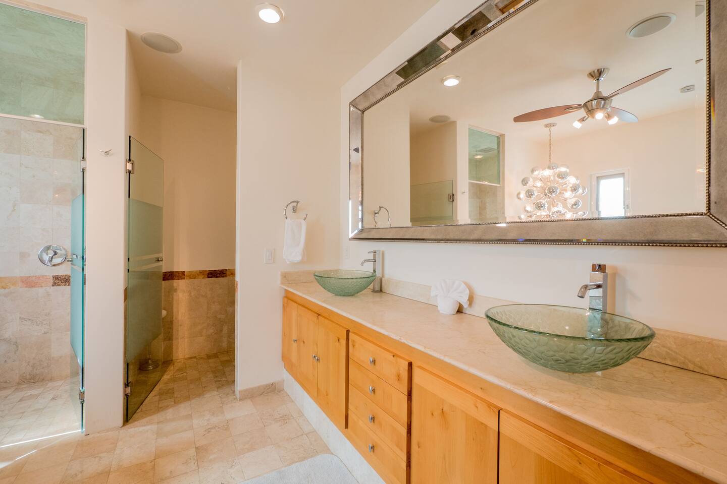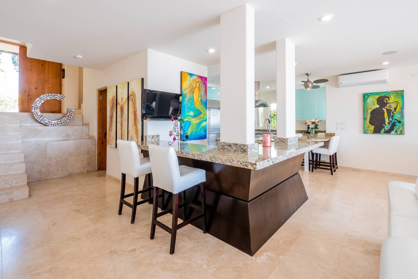 Inside, Villa Sirena showcases contemporary style with high-end finishes and a warm, inviting décor. The gourmet kitchen features granite countertops and premium appliances, ideal for preparing meals or arranging a private chef experience. Each bedroom includes its own en-suite bathroom, while the spacious master suite boasts a private balcony and a luxurious jetted tub that fills from the ceiling. With multiple indoor and outdoor living spaces, Villa Sirena is the perfect setting for an unforgettable Cabo escape.