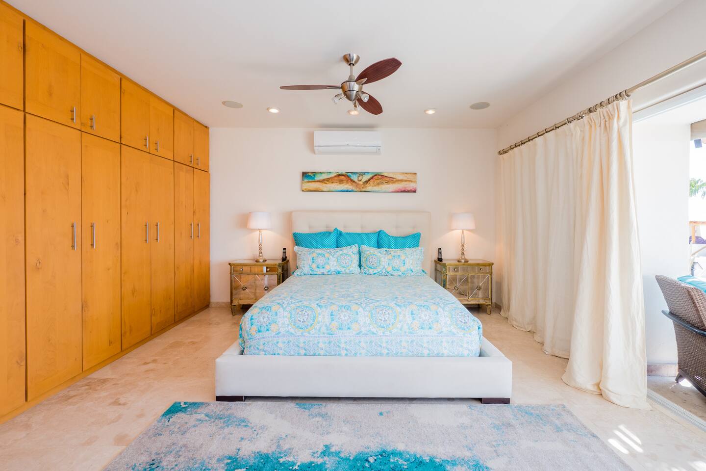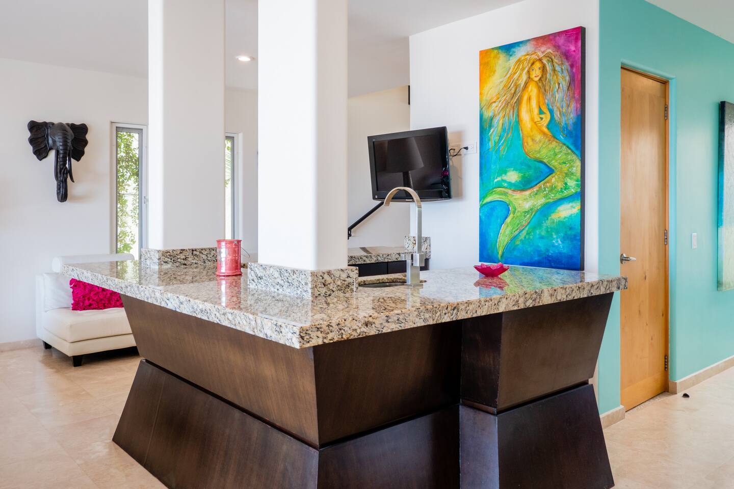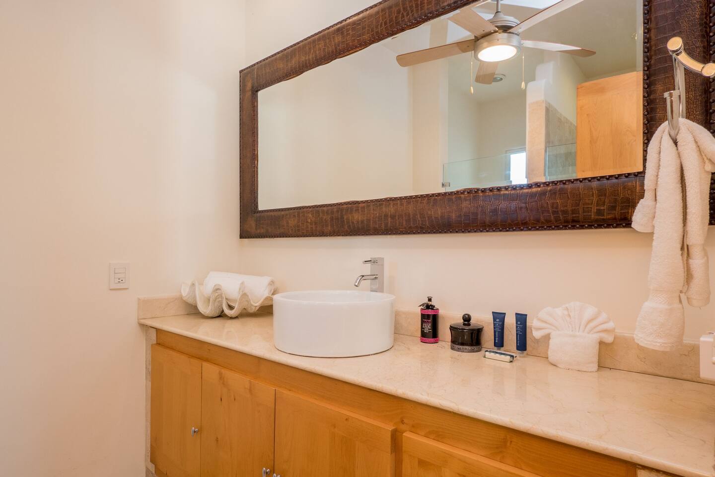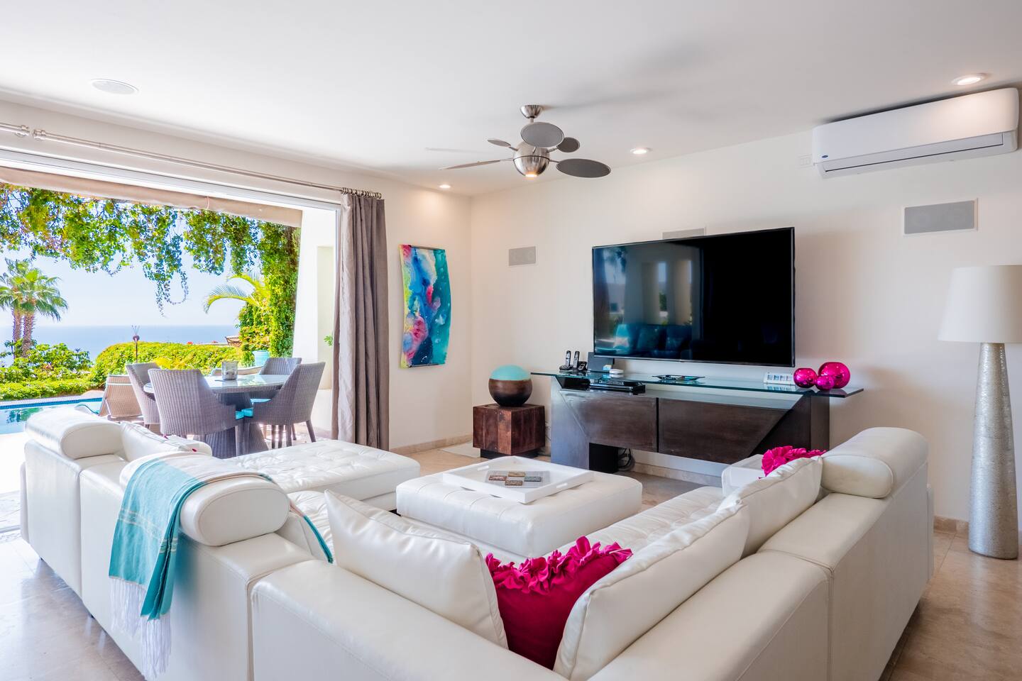 Inside, Villa Sirena showcases contemporary style with high-end finishes and a warm, inviting décor. The gourmet kitchen features granite countertops and premium appliances, ideal for preparing meals or arranging a private chef experience. Each bedroom includes its own en-suite bathroom, while the spacious master suite boasts a private balcony and a luxurious jetted tub that fills from the ceiling. With multiple indoor and outdoor living spaces, Villa Sirena is the perfect setting for an unforgettable Cabo escape.