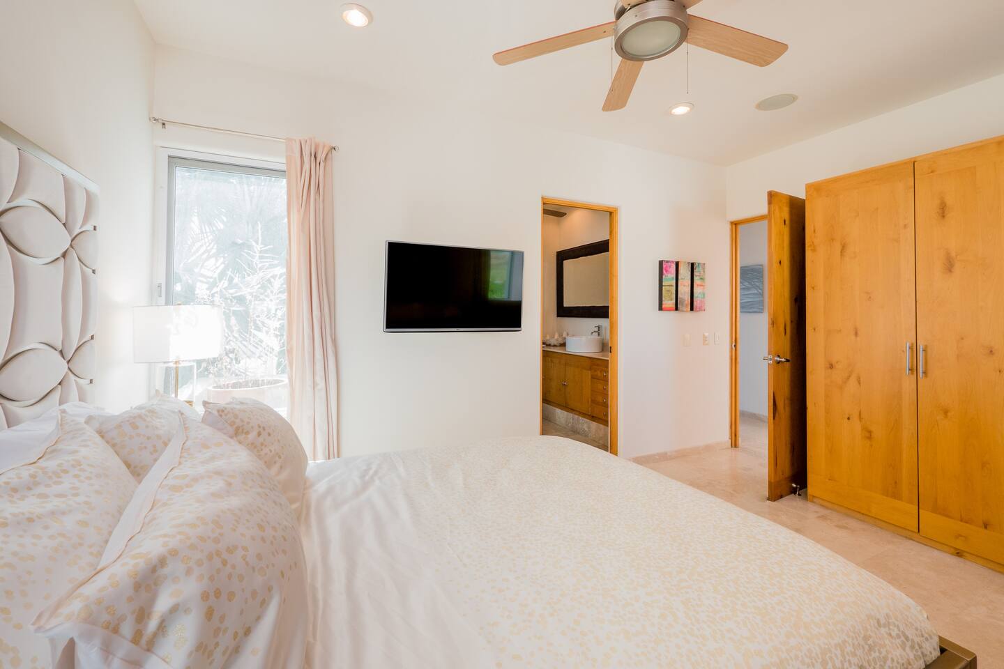 - Bedroom 1: 1 King bed, private balcony, en-suite bathroom with ceiling-fill jetted tub